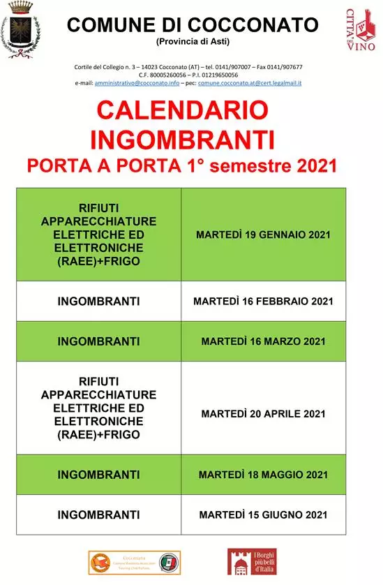 CALENDARIO DI RITIRO INGOMBRANTI PER IL PRIMO SEMESTRE 2021.