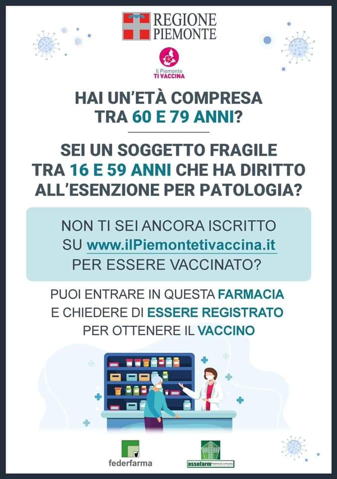 i soggetti fragili che hanno diritto ad esenzione per patologia di età compresa tra i 16 e i 59 anni, possono prenotare il vaccino sul sito della Regione Piemonte, in autonomia, oppure possono recarsi presso il proprio Comune muniti di tessera sanitaria; gli addetti provvederanno all'iscrizione.
